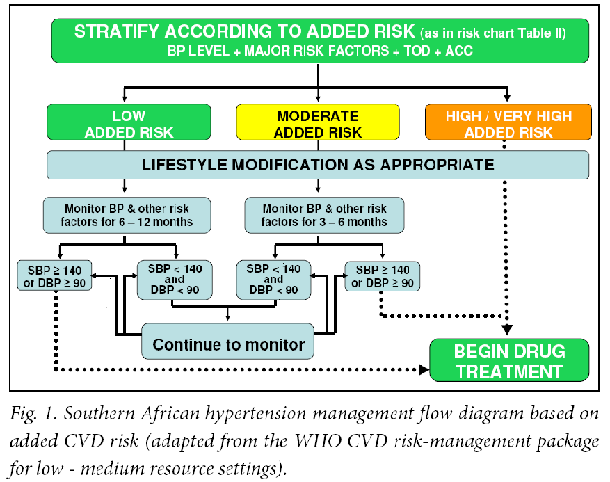 Figure 1 from the SAHS guidelines (see below) shows the approach to managing patients with an increased BP, who fall into the different risk categories of hypertension.