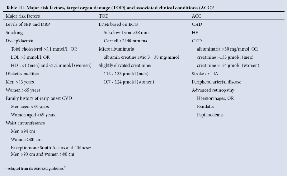 - To do this you need to account for major cardiovascular risk factors and the presence of target organ changes (see Table III from the SAHS guidelines, below).