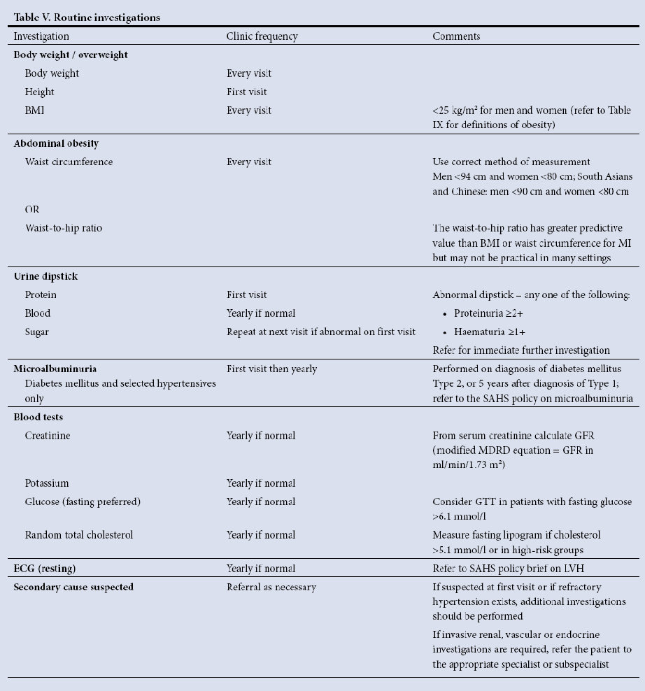 - To exclude renal failure as a secondary cause of hypertension, measurements of renal function are required. Table V from the SAHS guidelines (see below) lists the recommended routine basic investigations.