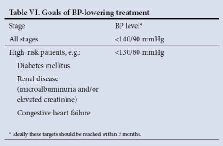 The target BP levels vary according to associated clinical conditions as shown in Table VI from the SAHS guidelines (see below).