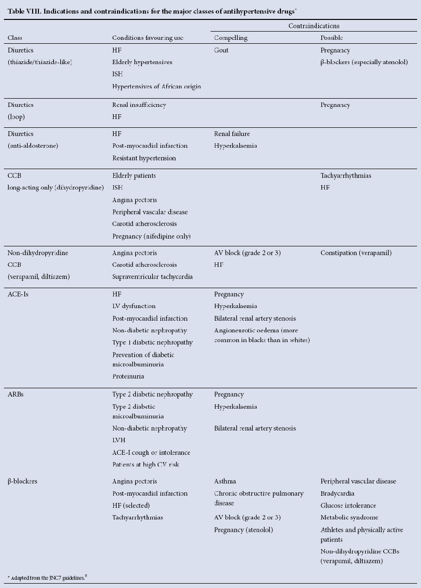 Table VIII from the SAHS guidelines (see below) lists the clinical considerations (indications) for the major drug groups when selecting antihypertensive drug therapy.